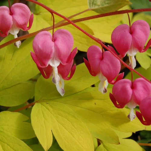 Dicentra Gold Heart, cunoscută și sub numele de „inimioara” este o plantă perenă spectaculoasă, care atrage toate privirile. Florile sale au o formă inconfundabilă de inimă, într-o nuanță delicată de roz intens, cu accente albe fine, dispuse elegant pe tije arcuite, ca niște ghirlande romantice.