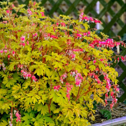 Dicentra Gold Heart – inimioare roz suspendate pe un fundal auriu. Plante perene de umbră și semiumbră
