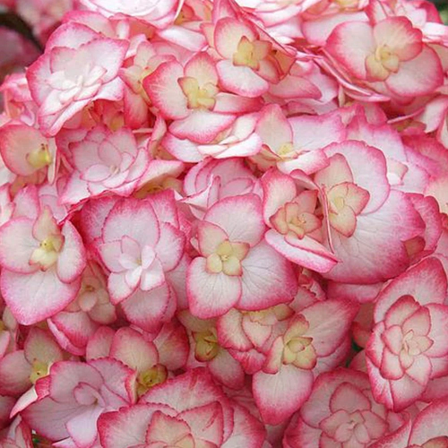 Florile prezintă petale albe cremoase, conturate delicat cu margini roz intens sau roșu-cireș, formând un efect bicolor elegant și romantic. Un avantaj remarcabil al acestei varietăți este faptul că nu își modifică culoarea în funcție de PH-ul solului, menținându-și aspectul distinct indiferent de condițiile de cultivare.