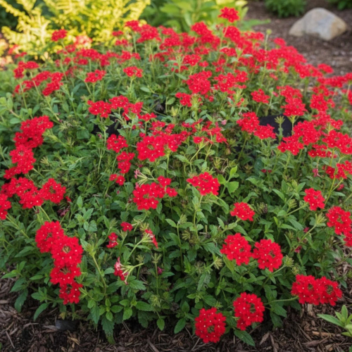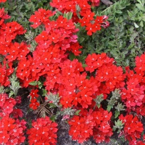 Florile sunt mici, dar extrem de numeroase, grupate în inflorescențe rotunde, în nuanțe intense de roșu, roz sau purpuriu. Acestea formează un covor vibrant de culoare, care atrage imediat privirea și animă orice colț de grădină. Înflorirea începe din primăvară și continuă până toamna târziu, oferind un spectacol de lungă durată.